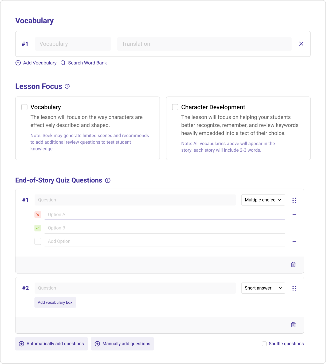 Customize reading materials and AI-generated quizzes to suit each student's needs